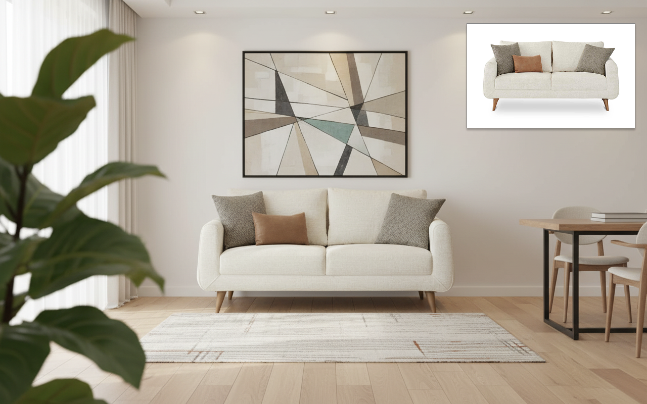 Prompt: “Modern minimalist frame or painting centered above it. Place a subtle contemporary rug in front of the sofa. Include a blurred decorative plant in the foreground for depth. Partially reveal a modern coffee or dining table with chairs on one side. Maintain bright natural daylight with recessed ceiling lights for a clean, photorealistic modern atmosphere.”
