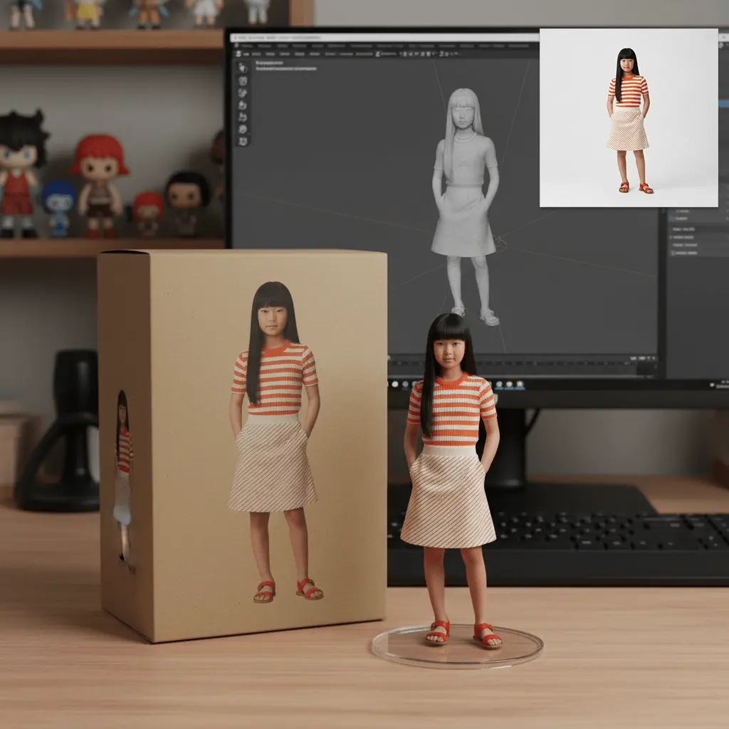 Prompt: “Turn this photo into a character figure. Behind it, place a box with the character's image printed on it,and a computer showing the Blender modeling process on its screen. In front of the box, add a round plastic base with the character figure standing on it set the scene indoors if possible.”