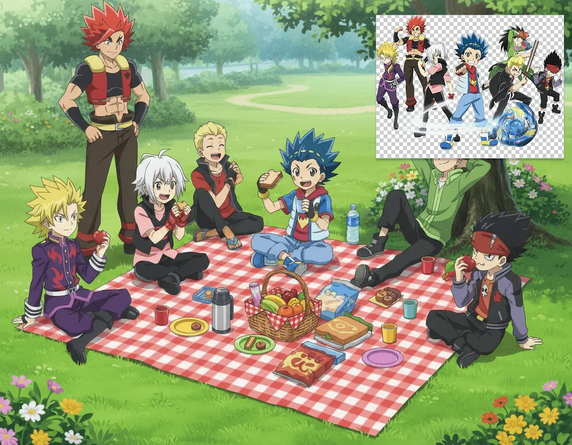 📌 Generates a colorful anime-style group artwork, placing all characters in a cheerful outdoor picnic setting. Perfect for manga storyboards, gaming visuals, fan art, and entertainment projects.